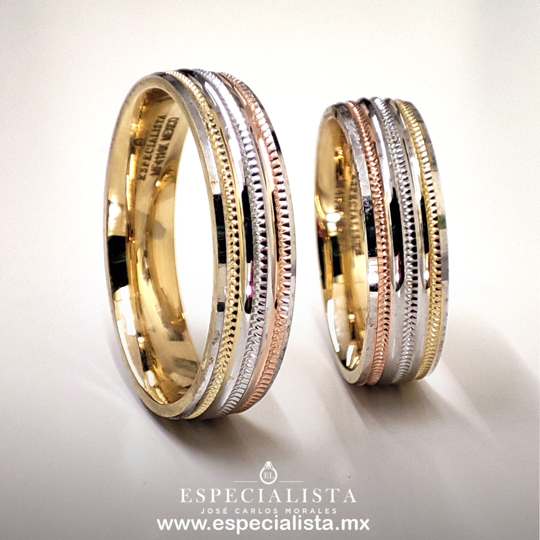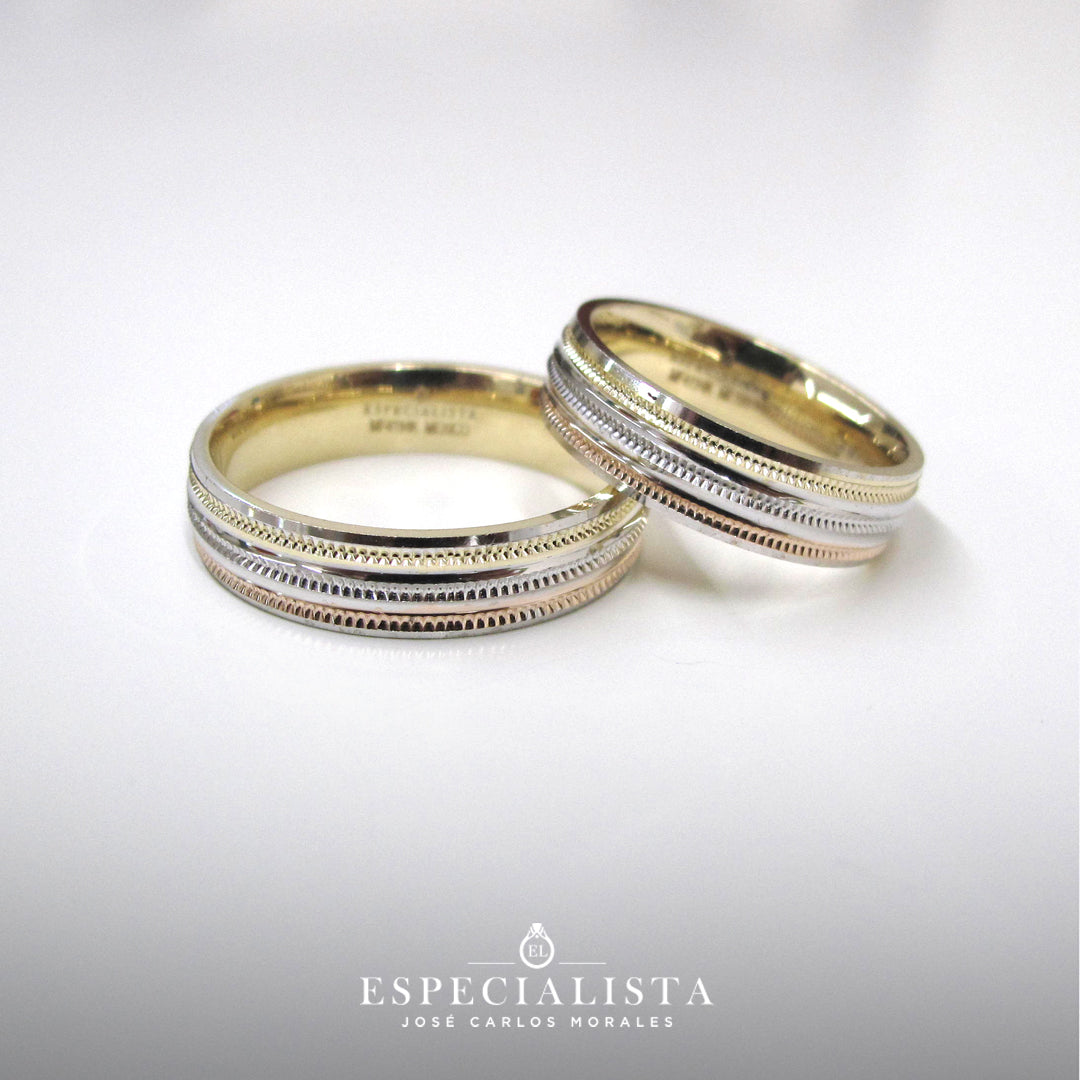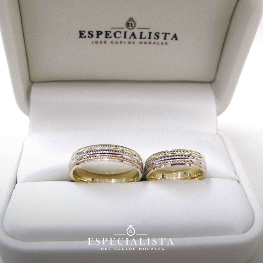 Par de Argollas de Matrimonio en oro combinado en blanco, amarillo y rosa.
