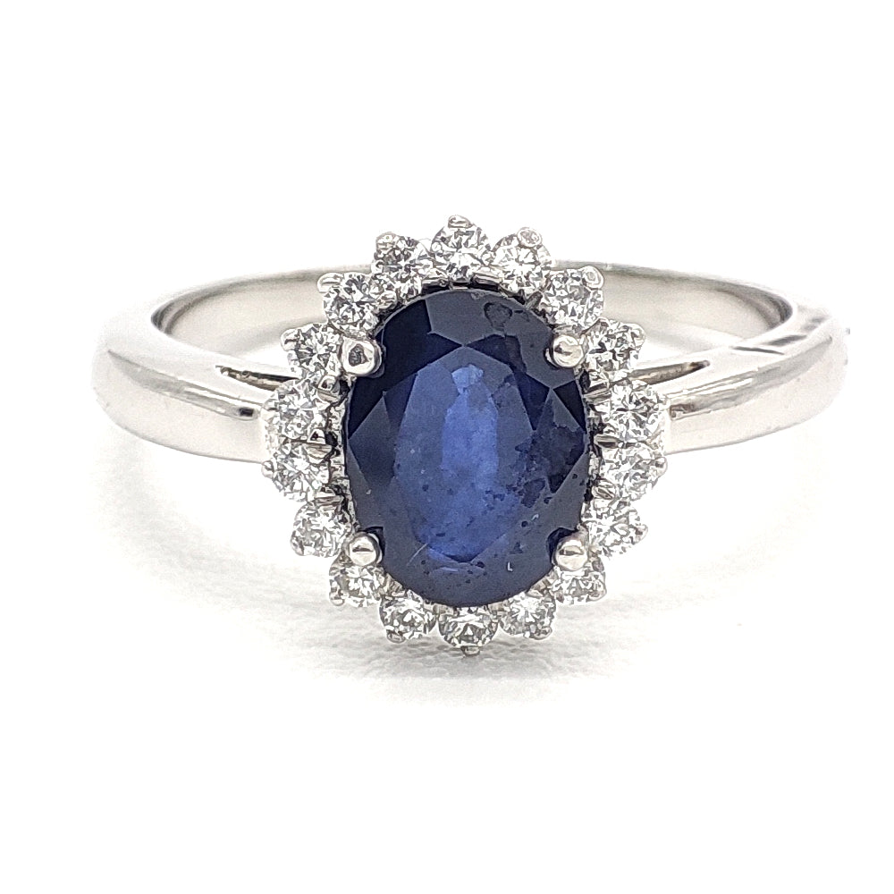 Anillo de compromiso en Platino con Halo de diamantes y Zafiro central.