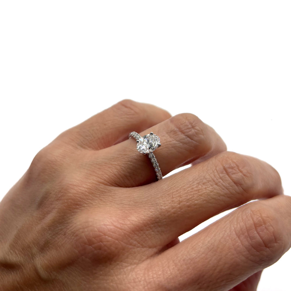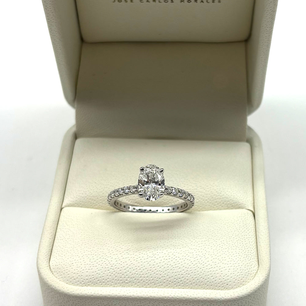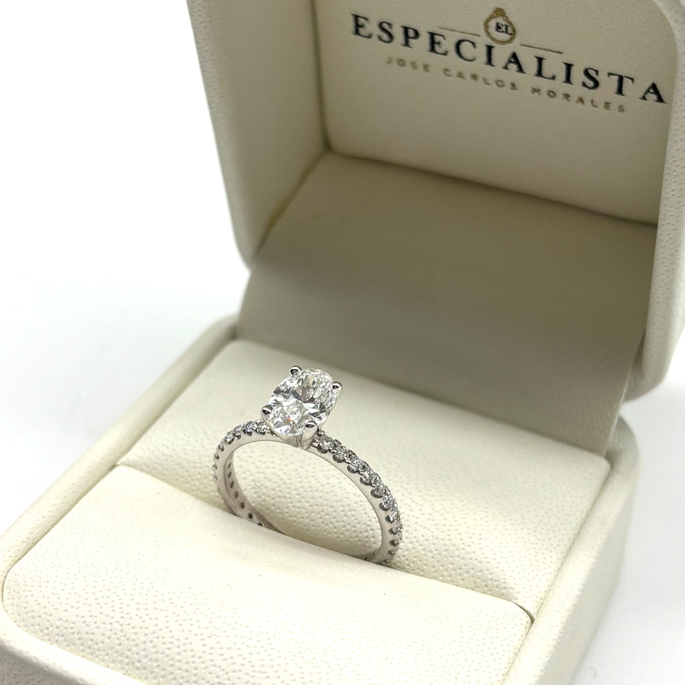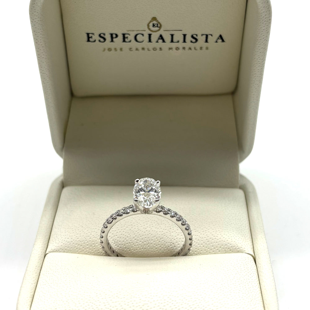 Anillo de compromiso tradicional en oro blanco de 14 Kilates con Diamante de Laboratorio en corte Oval, completo en diamantes.