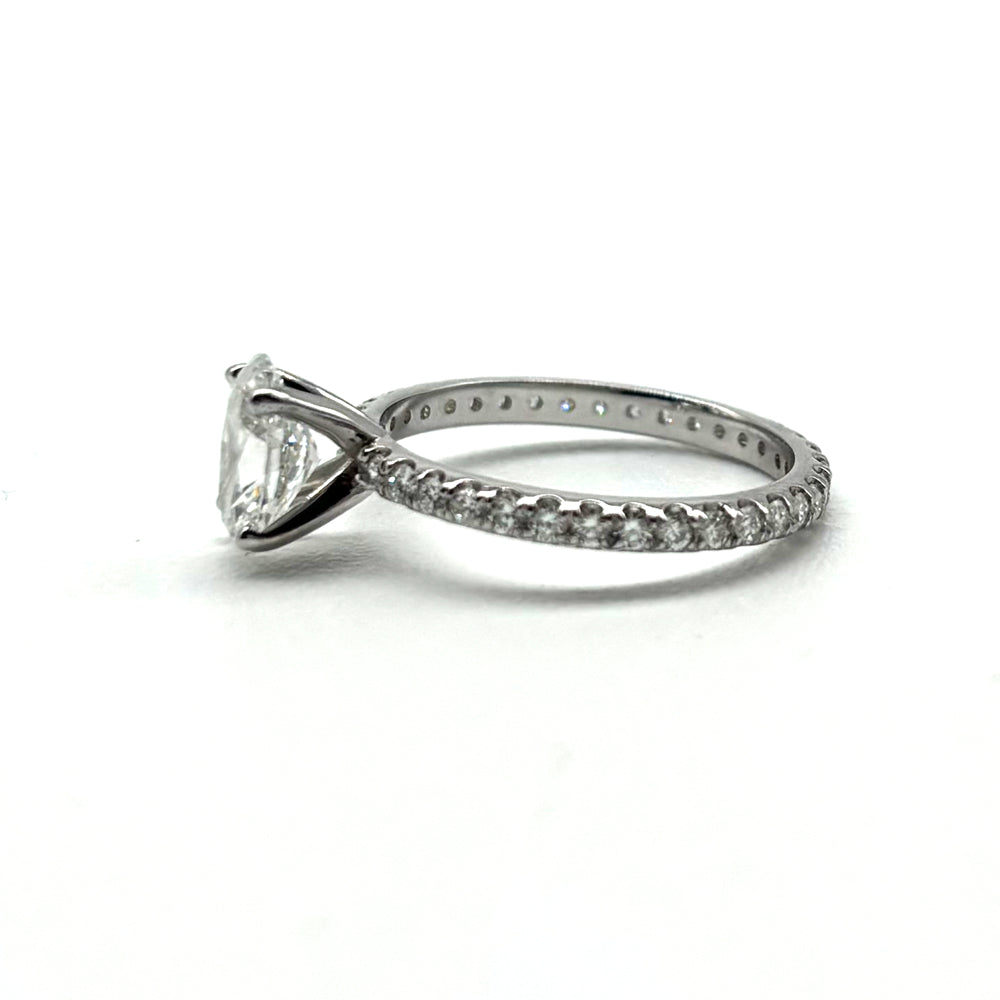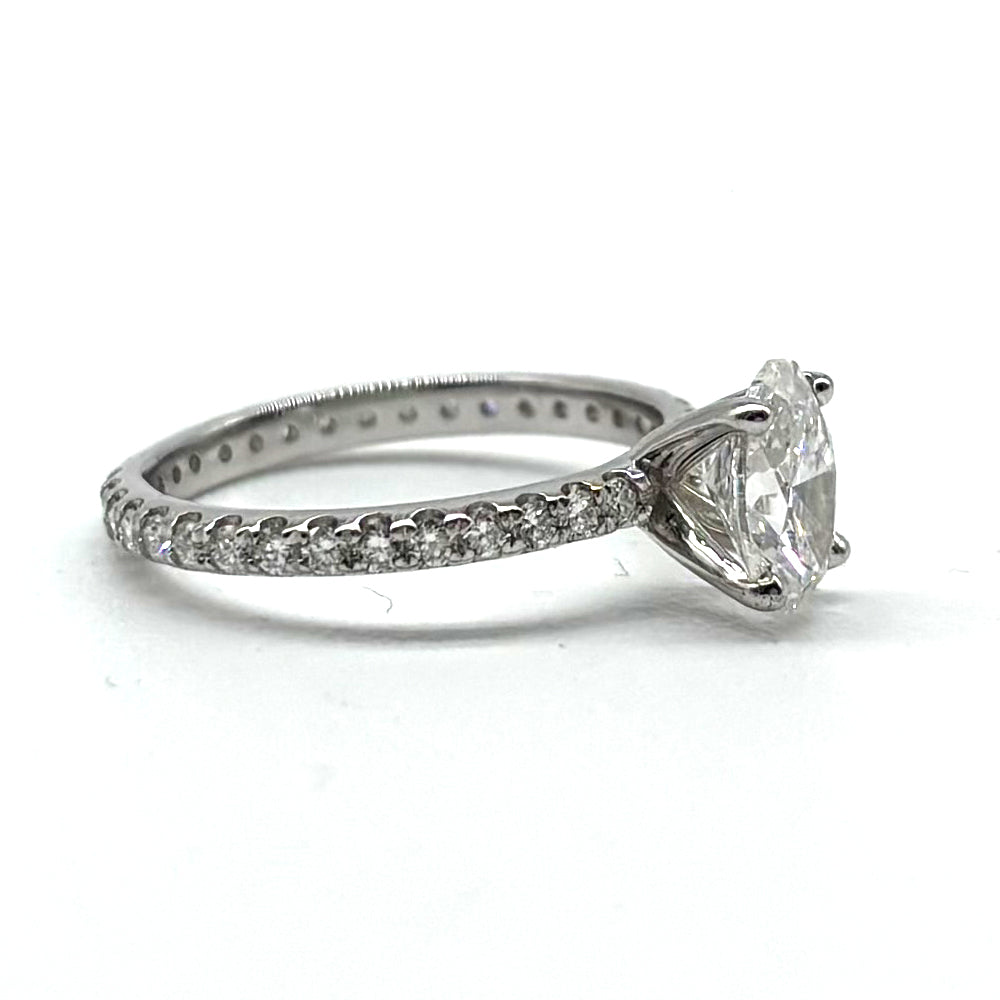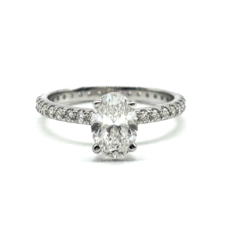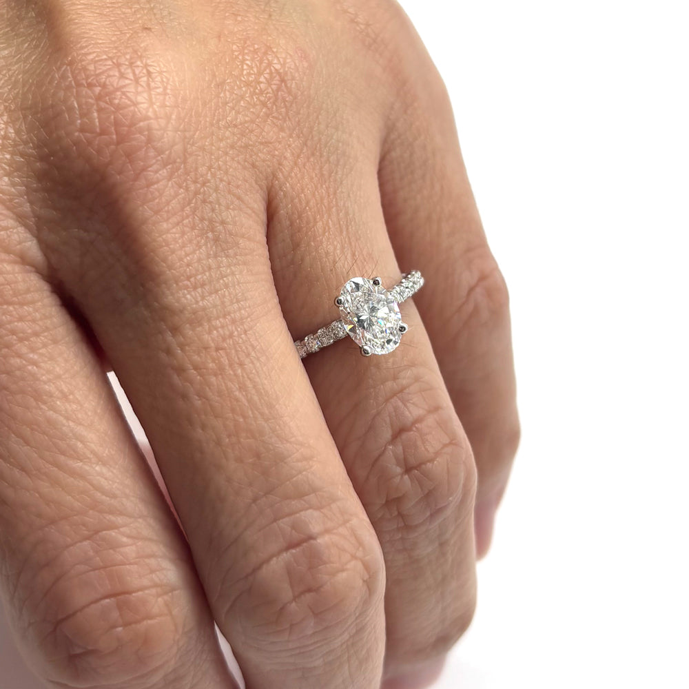 Anillo de compromiso tradicional en oro blanco de 14 Kilates con Diamante de Laboratorio en corte Oval, completo en diamantes.