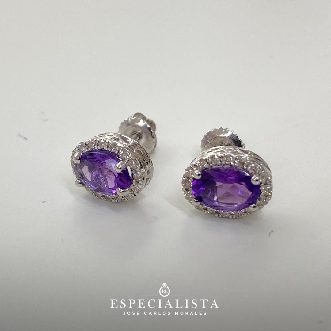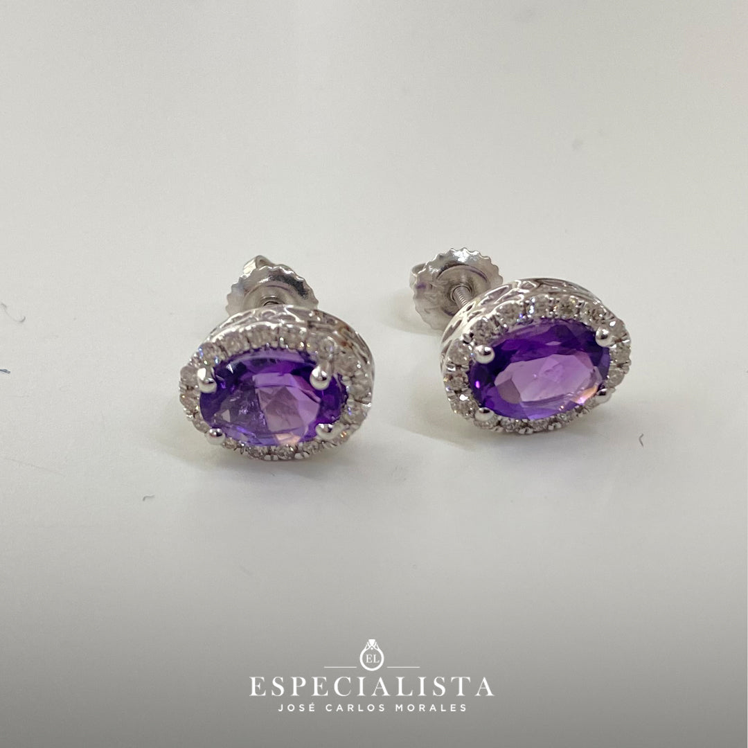 Aretes oro blanco 14k con piedras preciosas Amatista y Diamantes