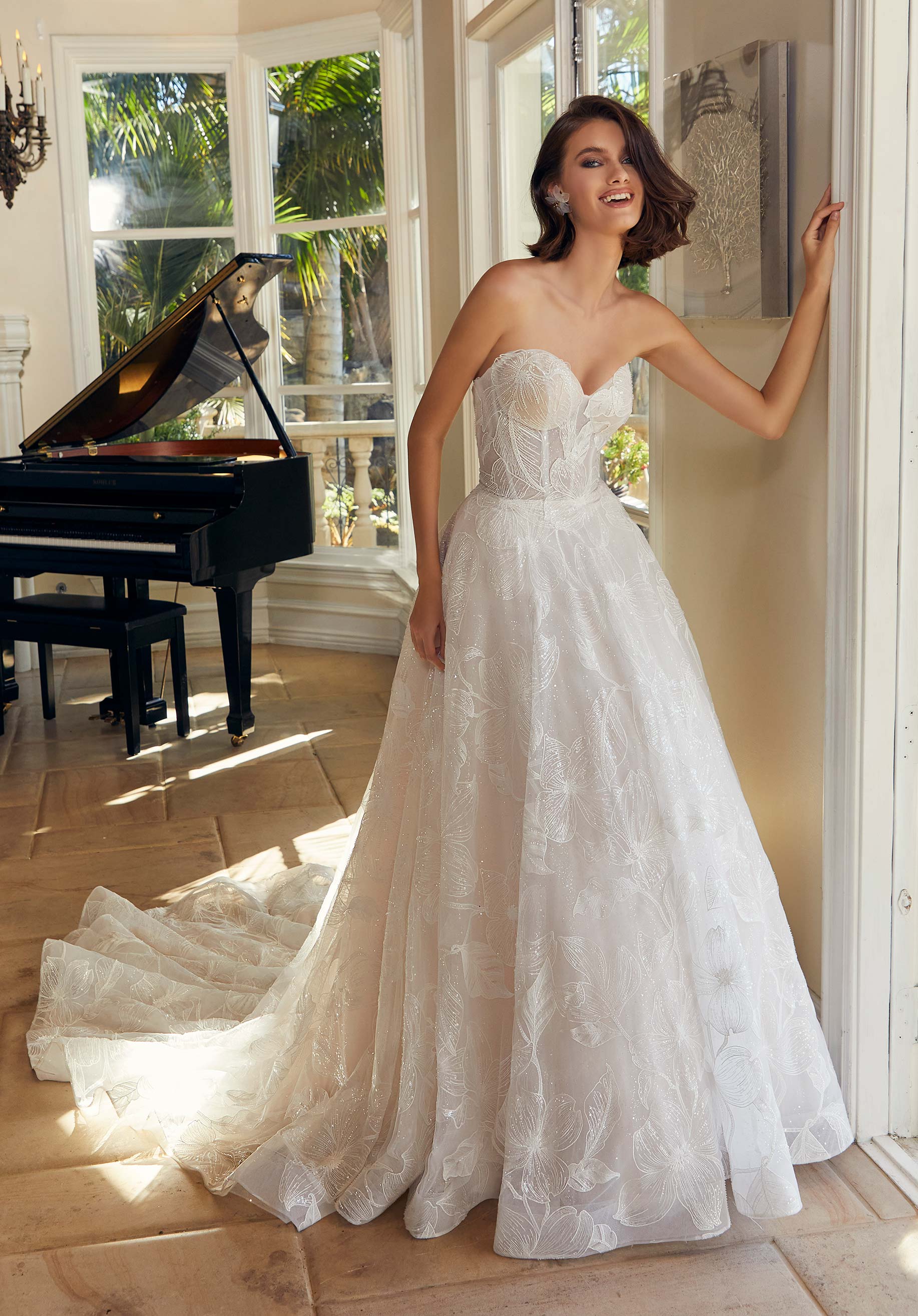 Vestido de novia de diseño Tallulah es un impresionante vestido de fiesta en corte A con un ilustrativo bordado floral, el corpiño transparente tipo corsé le da un toque romántico, y una falda brillante. Las mangas largas desmontables realzan el impresionante bordado.