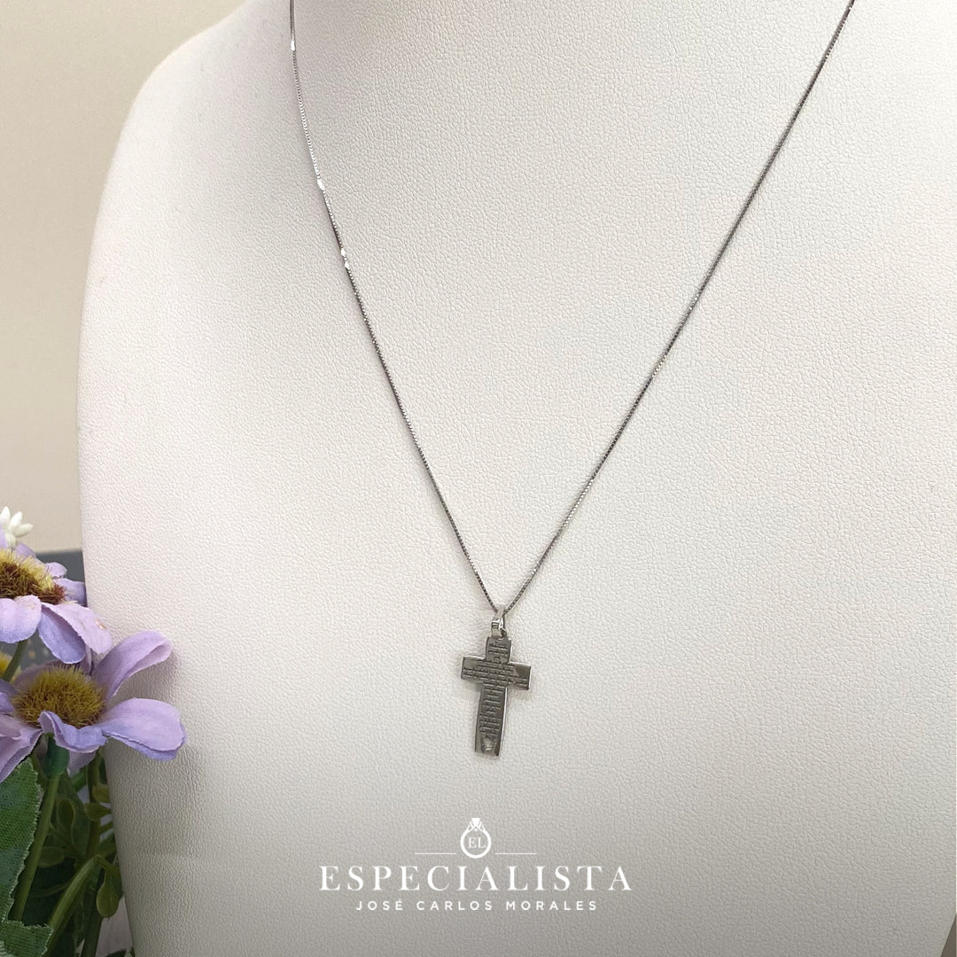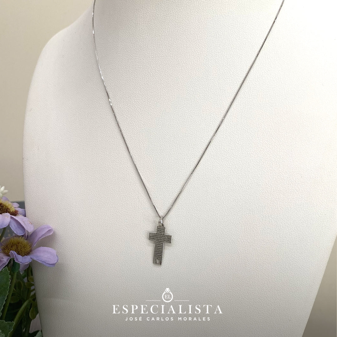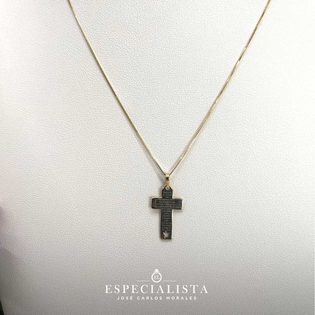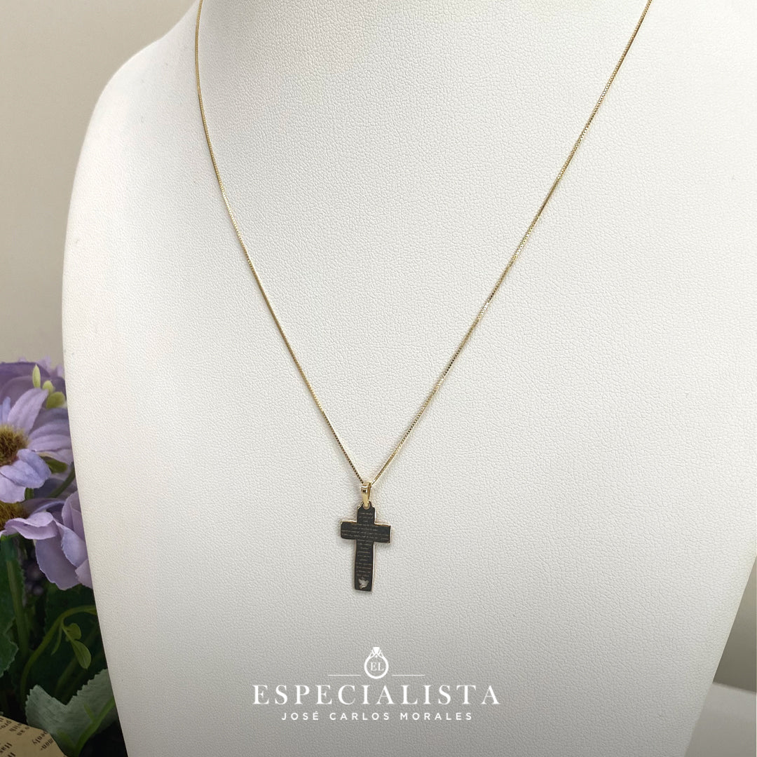 Lleva la fuerza de la oración con esta hermosa cadena en oro amarillo/blanco con cruz, grabado con el Padre nuestro.