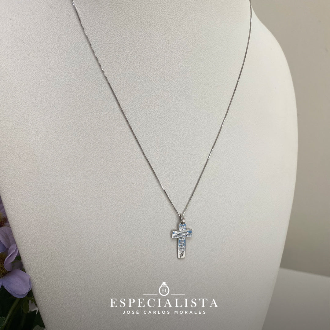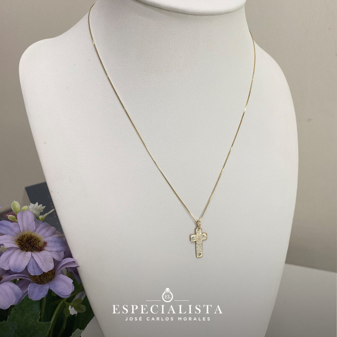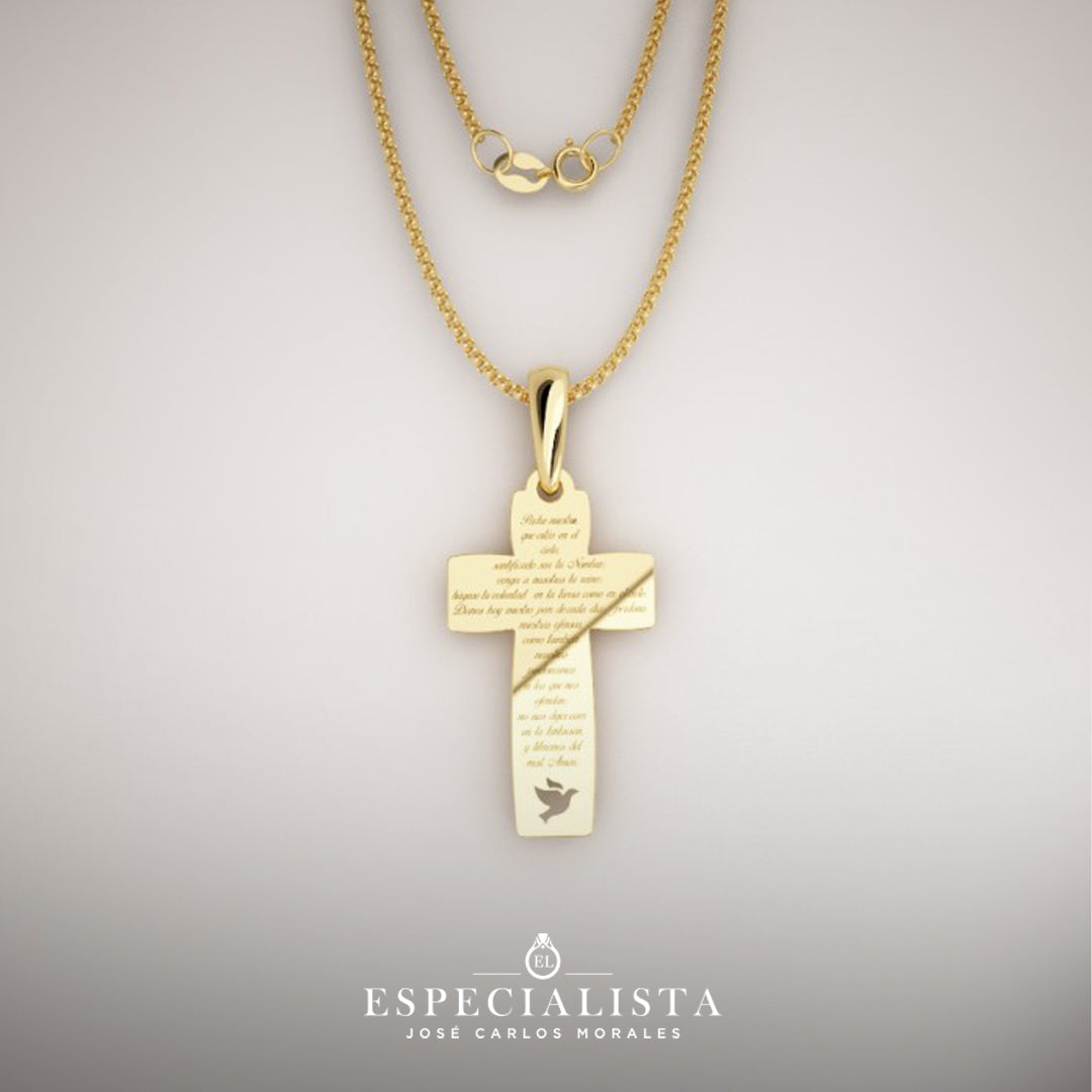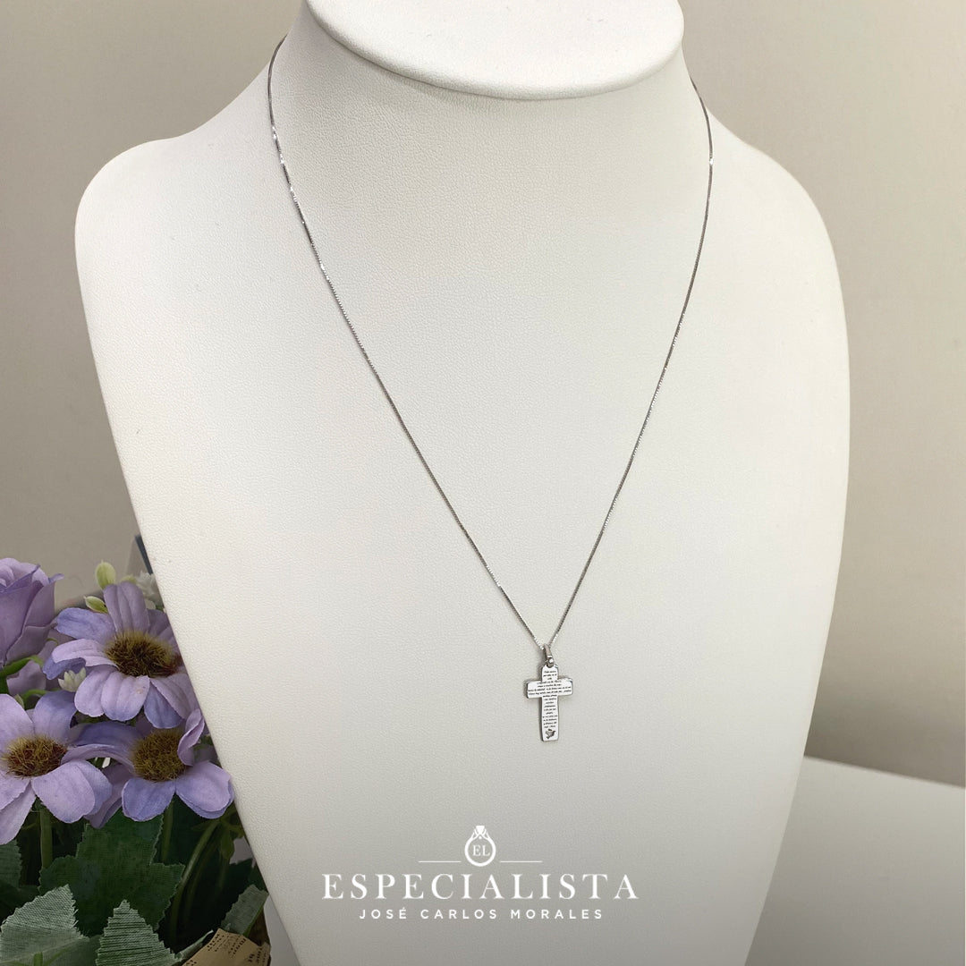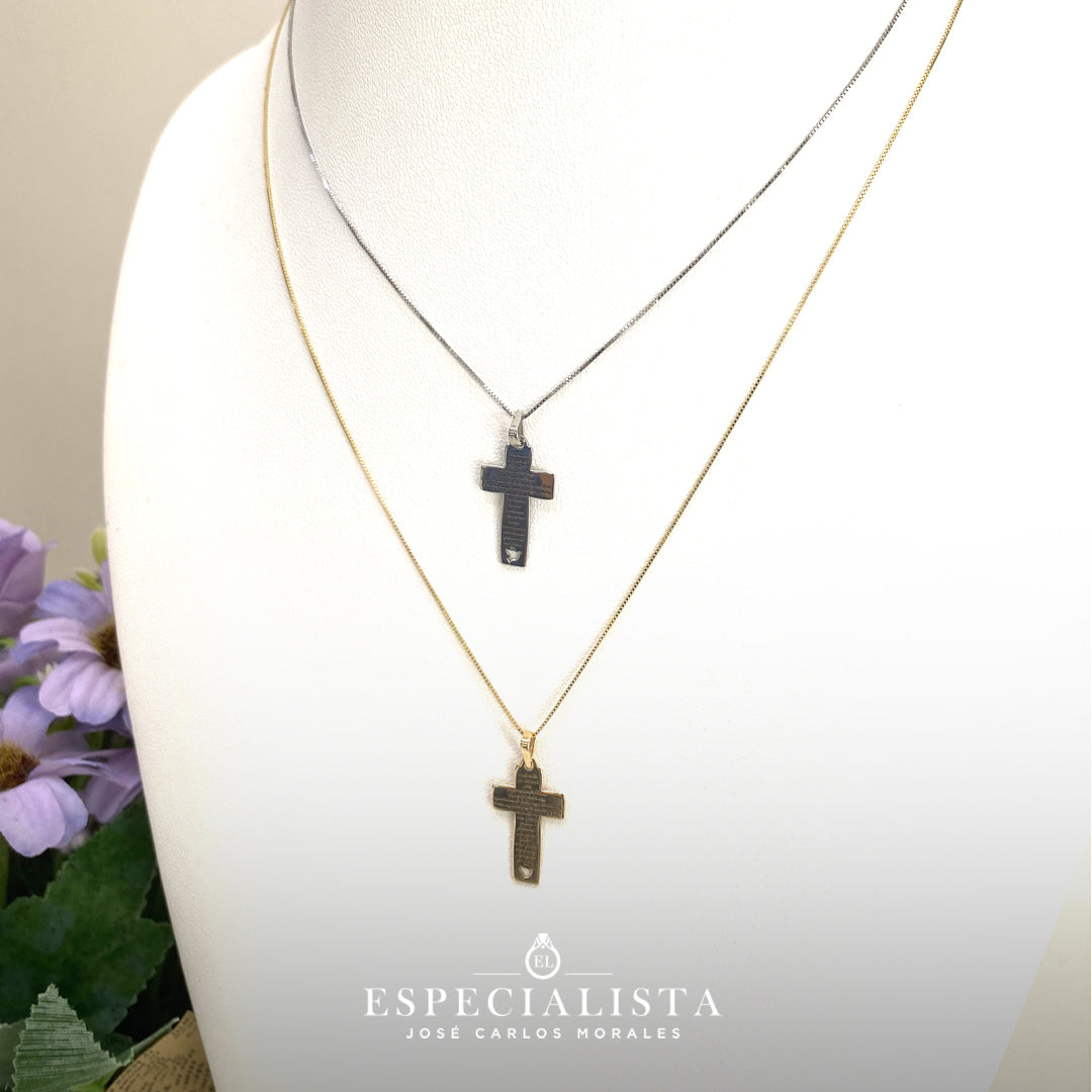 Lleva la fuerza de la oración con esta hermosa cadena en oro amarillo/blanco con cruz, grabado con el Padre nuestro.