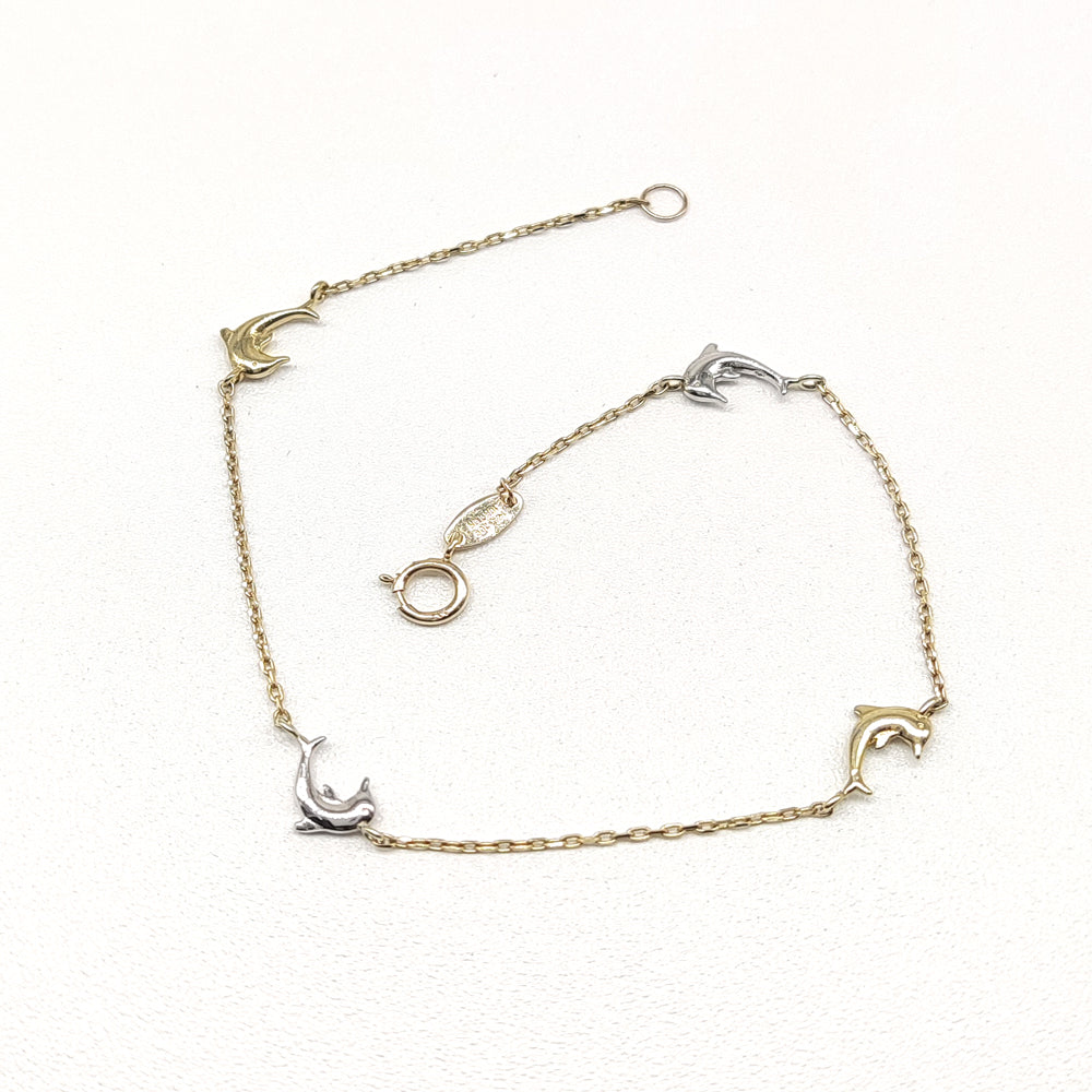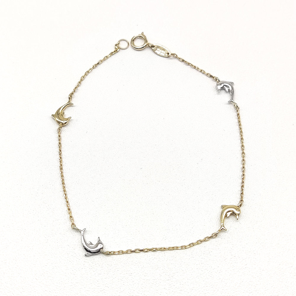 Pulso en oro amarillo de 10 kilates con delfines en oro florentino