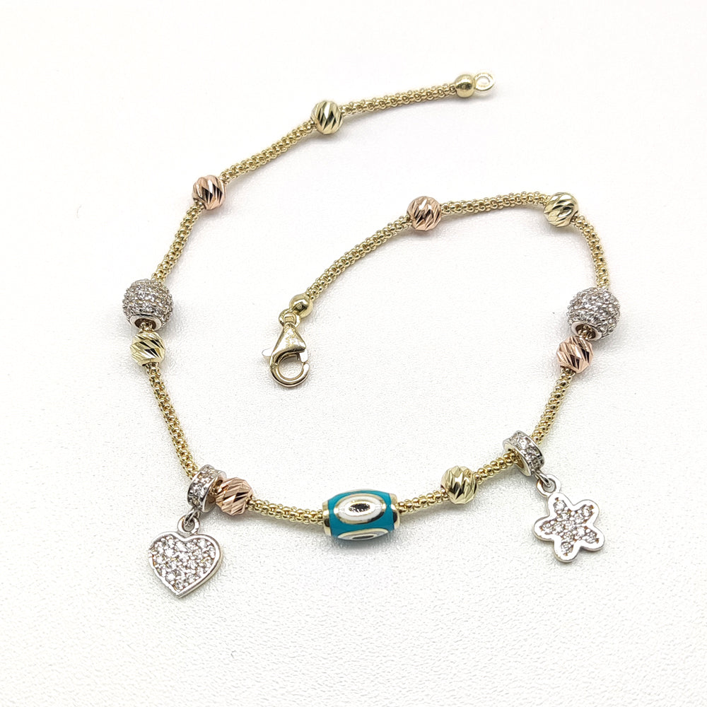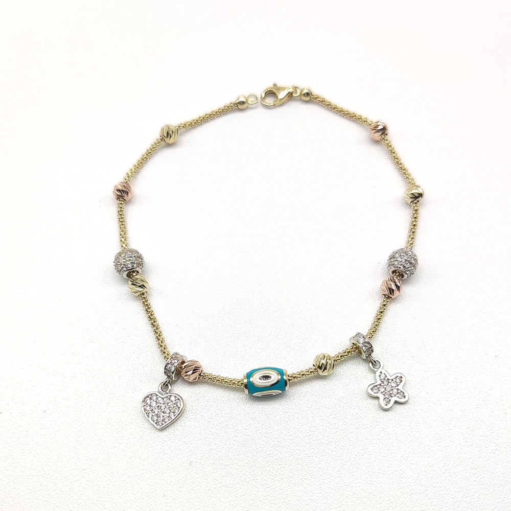 Pulso en oro amarillo de 10 kilates con charms colgantes en corazón y estrella