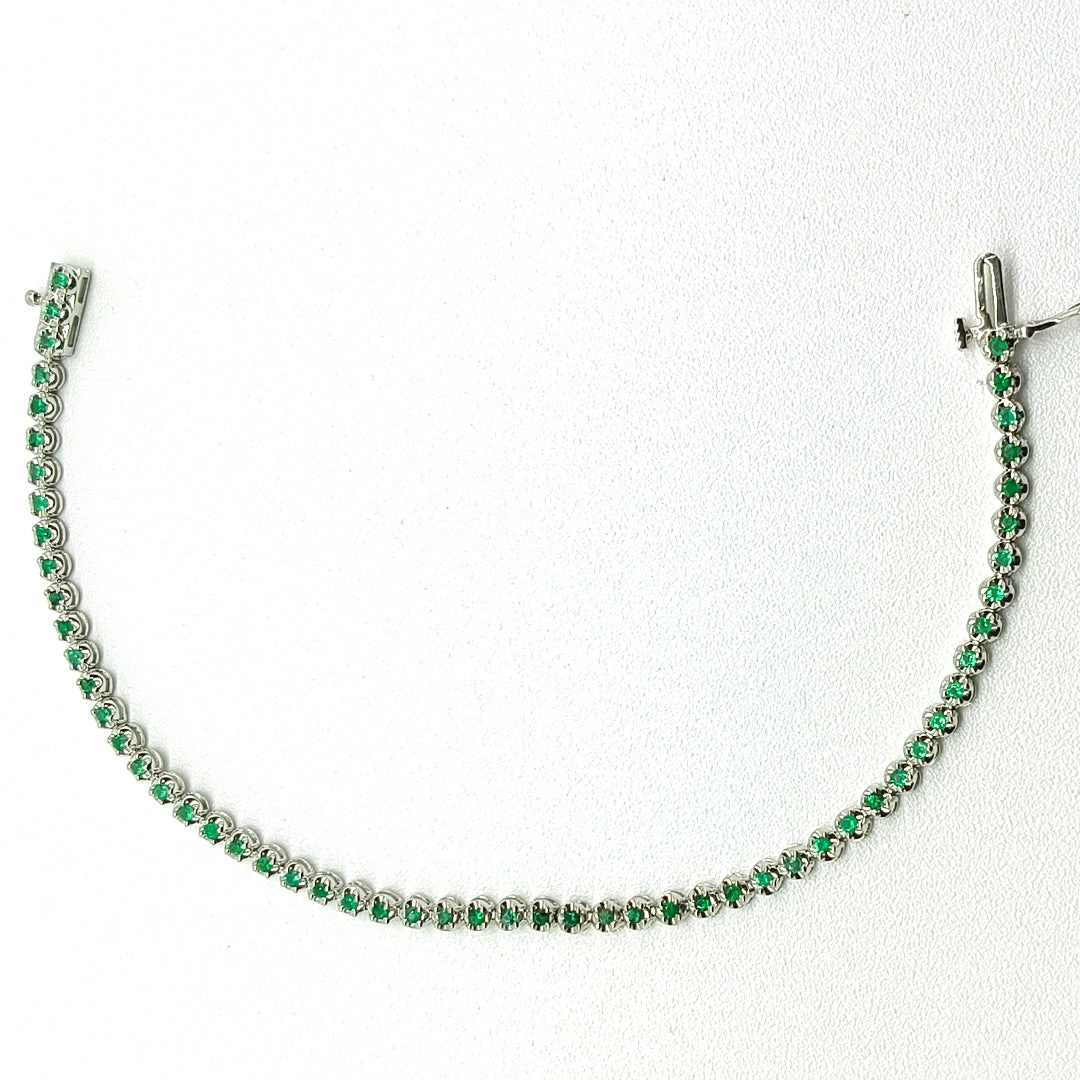 Pulso tipo tenis con Esmeraldas, fabricado en oro blanco de 14 Kilates.