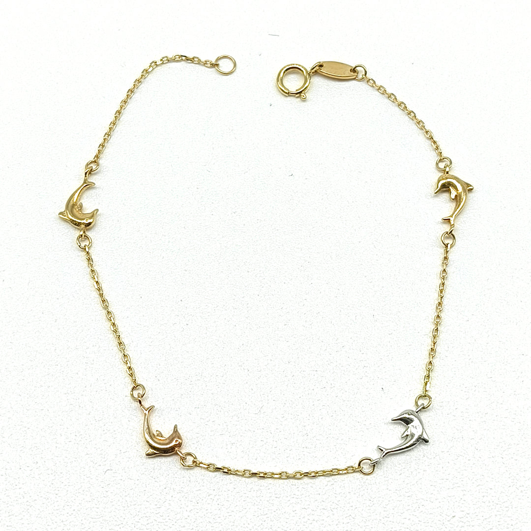 Pulso en oro amarillo de 14 Kilates con delfines en oro florentino
