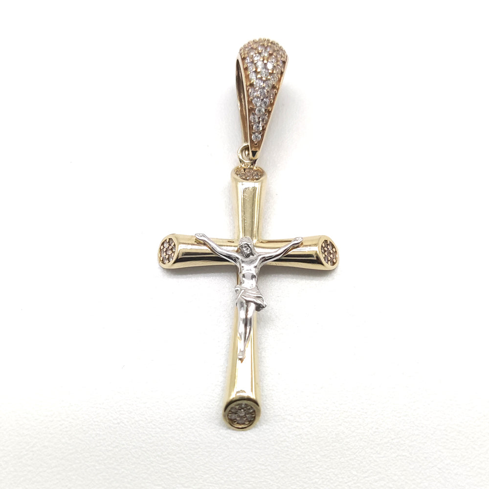 Cruz en Oro Amarillo de 10 Kilates con circonias importadas de alta calidad.